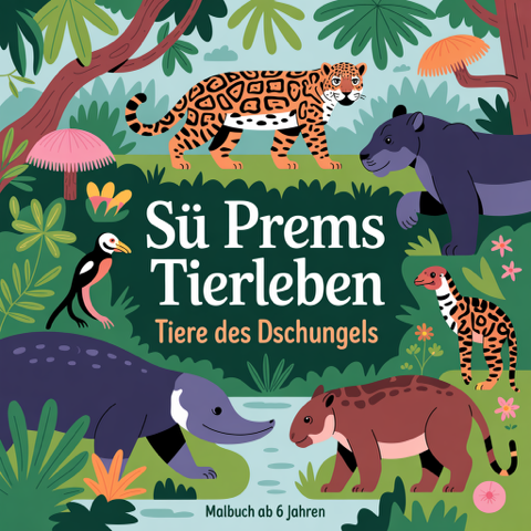 Willkommen im aufregenden Dschungel! Abenteuer pur mit 30 liebevoll ausgewählten Dschungeltieren. Das kreative Malbuch ist perfekt für kleine Abenteurer ab 6 Jahren und bietet 30 spannende, realistisch gezeichnete Tiermotive, die zum Ausmalen einladen und die Fantasie beflügeln. Erkunde den geheimnisvollen Urwald und entdecke faszinierende Tiere wie den majestätischen Jaguar, den mächtigen Gorilla, die riesige Pythonschlange, den exotischen Tukan oder den gefährlichen Pirania. Die einfachen Formen und klare Linien der Tiere sind ideal zum Ausmalen. Perfekt für Zuhause, unterwegs, im Auto oder im Urlaub. Ein tolles Geschenk für kleine Tierliebhaber: Ob zum Geburtstag, zu Weihnachten oder einfach so – „Sü Prems Tierleben“ ist das ideale Geschenk, um die Wunder der Tierwelt zu entdecken und die Kreativität zu fördern.
